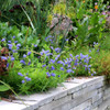 Large deep blue flowers in early summer, low mounds of fresh green leaves.