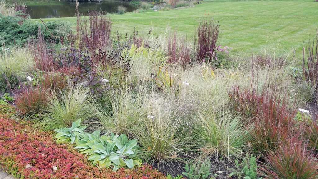 'Blackhawks' in awarded naturalistic garden, designed by Andrew Marrs Garden Design. About mid fall, Bloomington, IN, zone 6a