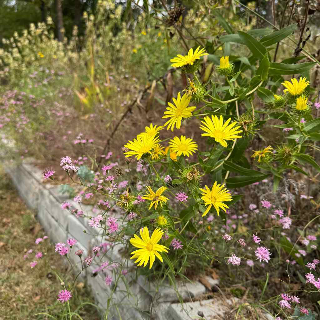 Early fall 2025 - both native yellow Grindellia lanceolata (Narrowleaf Gumweed) with pink-purple annual Palafoxia callosa (Small Palafox).