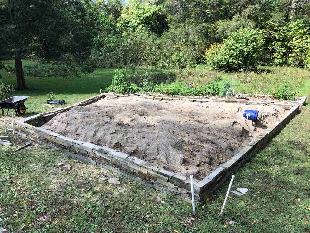 After the sand was brought in, I dry stacked “rip-rap” cut limestone rocks around the sand (these rocks sit on layer of gravel to avoid heaving in the winter). Bloomington is famous for it’s limestone quarries and cut limestone is easily available and affordable - 1 pound of rock per 1 penny.