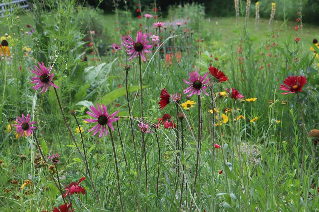 Second year, early summer 2023 - Echinacea tennesseensis (Tennessee Coneflower) with Gailardia aristata 'Red' (Blanket Flower). Coreopsis lanceolata (Lance-leaf Tickseed) in the backround. Another wonderful coneflower for drier/drained soils. Blanket Flower is durable in sand and seeds around. Tickseed needs more nutrients and vanished quickly and doesn't re-seed.