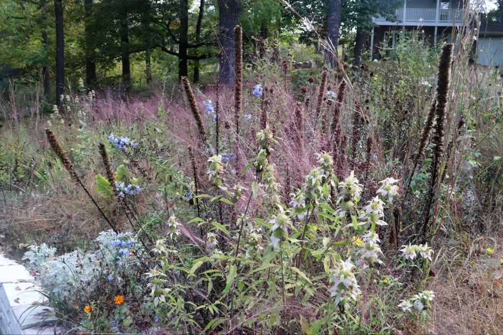 Second year, earlier fall look, 2023. Muted fall colors, dominant grasses - Eragrostis spectabilis (Purple Love Grass) and Muhlenbergia capillaris (Pink Muhly Grass), Monarda punctata (Spotted Beebalm), blue Salvia azurea (Blue Sage). Seedheads of Liatris lancifolia (Blazingstar). Gray foliage on the left - Artemisia 'Powis Castle' (Wormwood 'Powis Castle') - it did well, but the blackwalnuts roots deeper in the soil probably killed all of them.