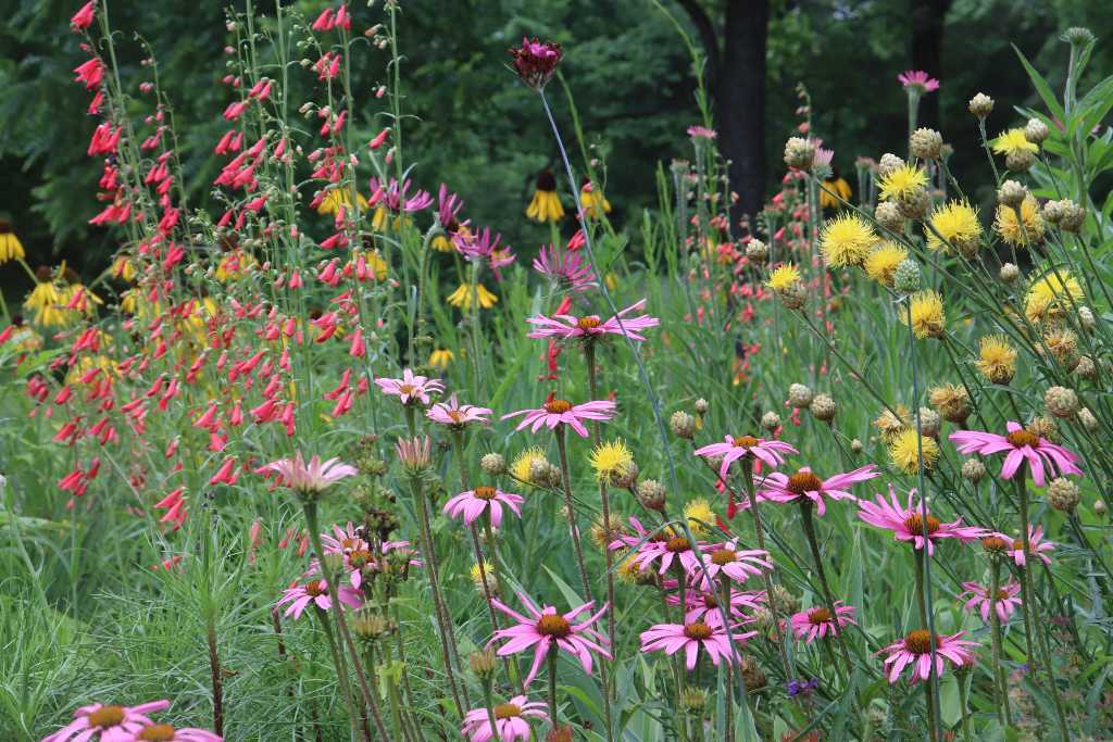 Second year, early summer 2023 - Penstemon barbatus 'Coccineus' (Beard-lip Beardtongue) did the best early on, it bloomed less and less in later years. Echinacea x 'Public Domain' is excelllent plant (front of the pic). Yellow Centaurea orientalis (Yellow Knapweed) does well and persists. In the background you can see purple Echinacea tenneseensis (TN Coneflower) and yellow Echinacea paradoxa (Yellow Coneflower) - both superior native plants, durable and long-lived work horses.