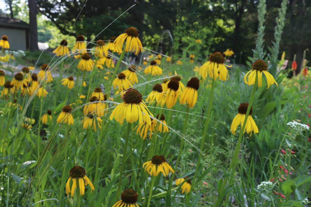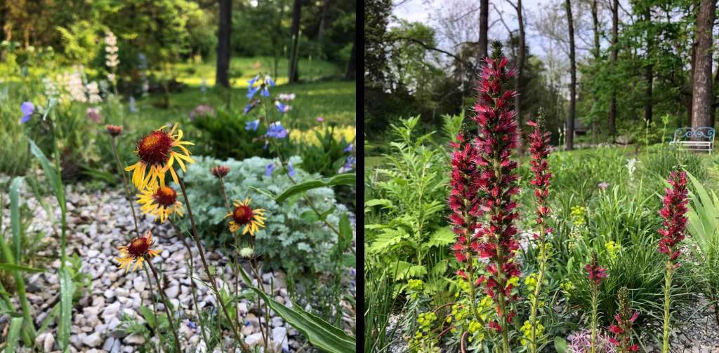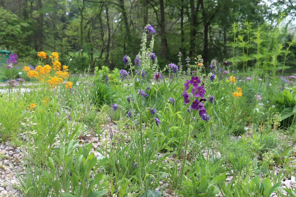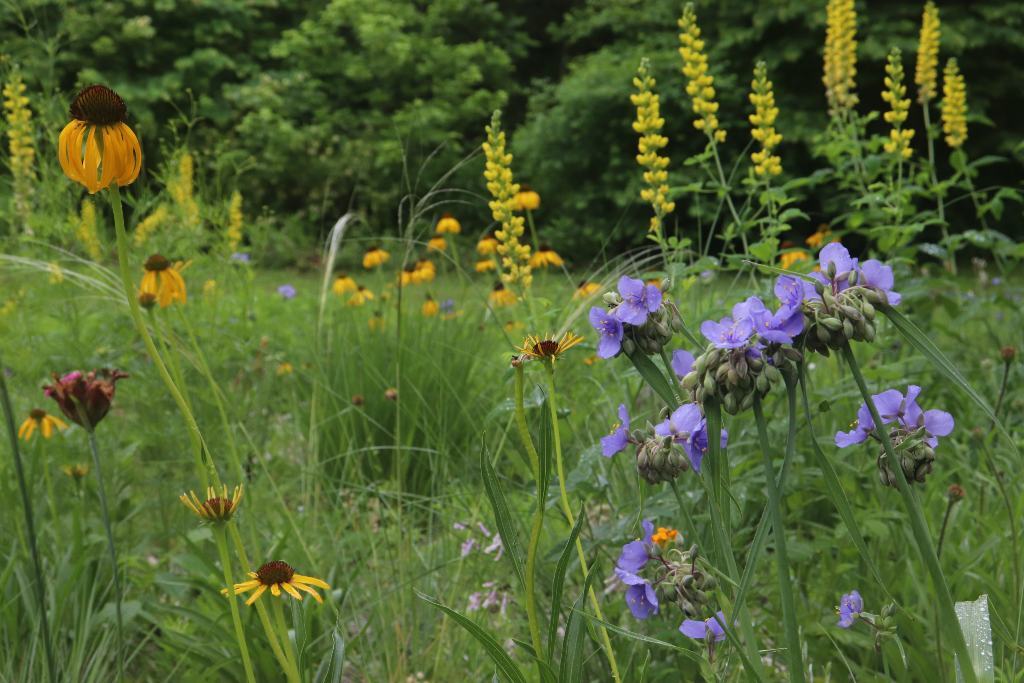 Third year - late spring/early summer 2024 - from the left Echinacea paradoxa (Yellow Coneflower), Stipa capillata (Slender Feather Grass), tall yellow Thermopsis caroliniana (Carolina Lupine) and blue Tradescantia ohiensis (Ohio Spiderwort). All of these thrive.
