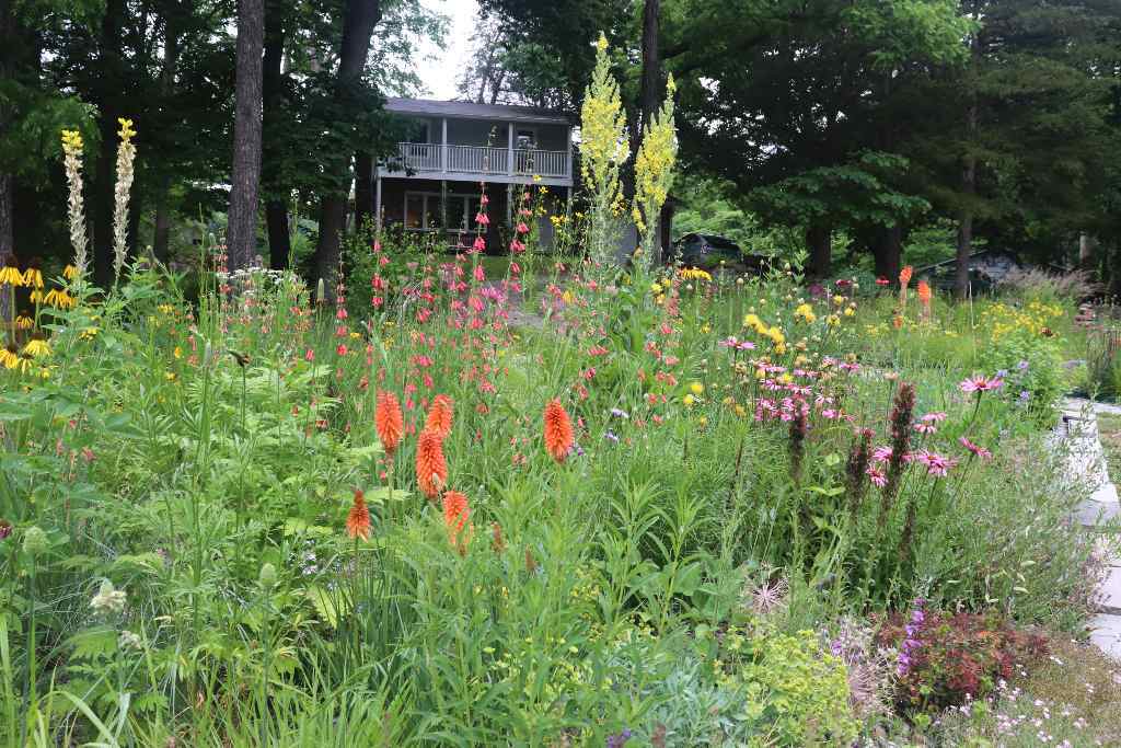 Mid to late June 2025, view across the raised bed (with rich soil) towards the sand bed (with lean sand). Tall orange native biennial Ipomopsis rubra (Standing Cypress) is in it's bloom peak.