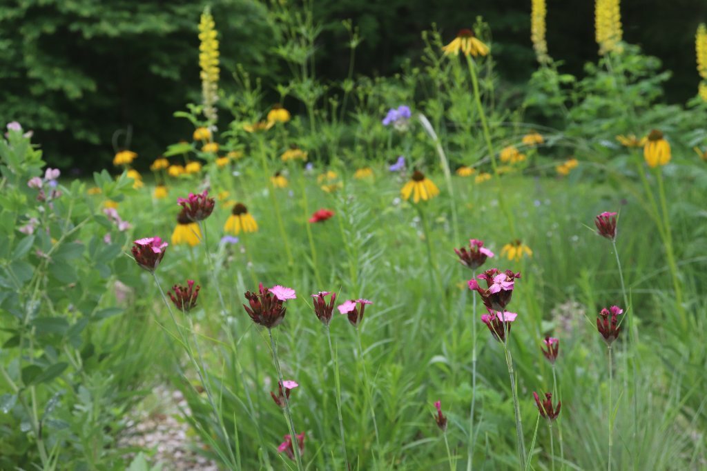 Mid spring 2025 - Dianthus carthusianorum (Carthusian Pink) is well adapted to drained soils. In the background Echinacea paradoxa (Yellow Coneflower) and Tradescantia ohiensis (Ohio Spiderwort).