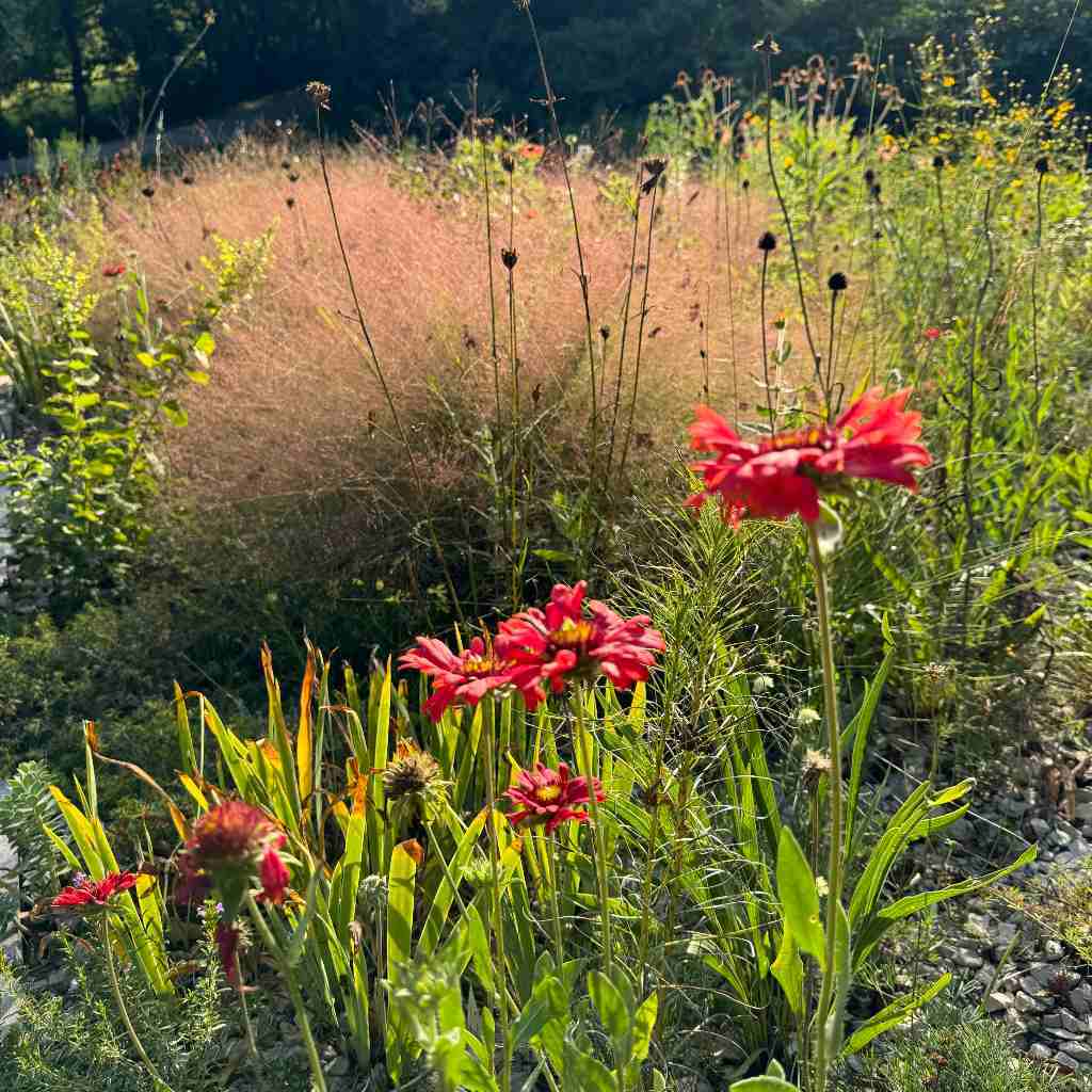 Second year 2023, mid to late fall - Muhlenbergia capillaris (Pink Muhly Grass) - stuning in the backlight. The purplish flowers often persists till December.