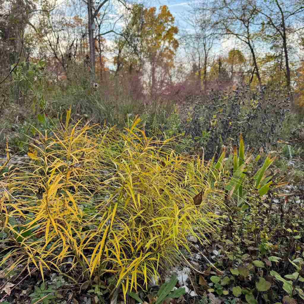 Third year, late fall 2024?end of the season - fall color of Amsonia 'Midway to Montana' (Bluestar hybrid), with Muhlenbergia capillaris (Pink Muhly Grass) in the background. Amsonia is slow and smaller in the sand. Peter Korn doesn't recommend those wide-clumping perennials, mostly because he wants to squeeze in many other more narrow plants. But I find it very refreshing to have some fall color in the sand bed.
