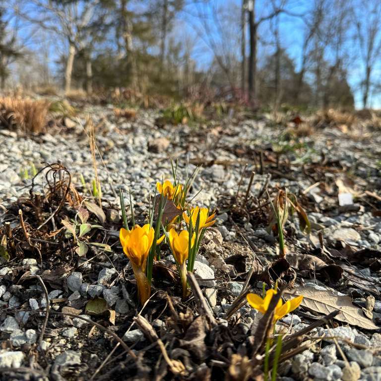 Third year, pre-spring 2024. Crocus chrysanthus 'Yellow Goldilocks' (Snow Crocus) is the earliest to bloom. Iris reticulata (Reticulated Iris) is greening up in the background.