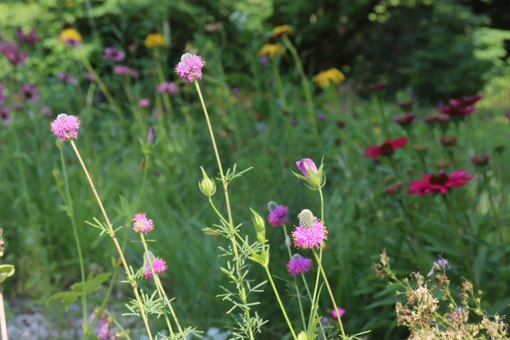 Third year, late spring/early summer 2024 - Dalea purpurea (Purple Prairie Clover) with Echinacea 'Kismet Raspberry' (on the right). Both do very well. Dalea has a bit shorter flowers, but it could also be the genotype.