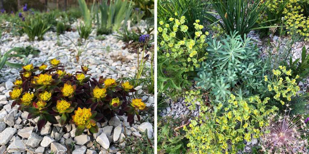 Euphorbias from dry/drained soil do well in the sand bed (they are harder to cultivate and keep alive in the nursery). Left - Euphorbia polychroma 'Bonfire' (Cushion Spurge 'Bonfire'), right : Euphorbia nicaeensis (Nice Spurge). Another one would be Euphorbia myrsinites.