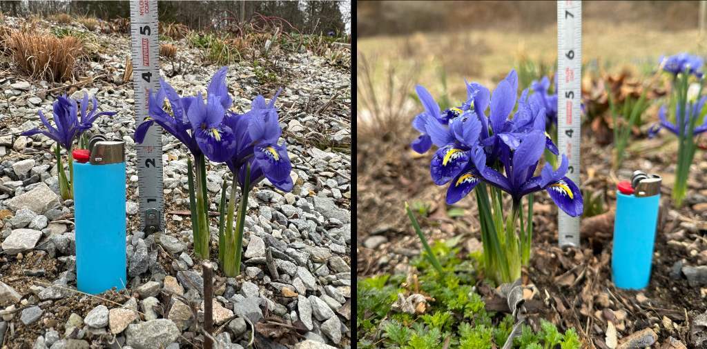 Iris reticulata 'Harmony' (Reticulated Iris) - size comparison : Left in the sand bed (plants are shorter, smaller, flowers are smaler and also bloom for shorter period). Right - the same Iris in rich and drained soil (the plants are more robust, flowers larger, and they last about 5 days longer).