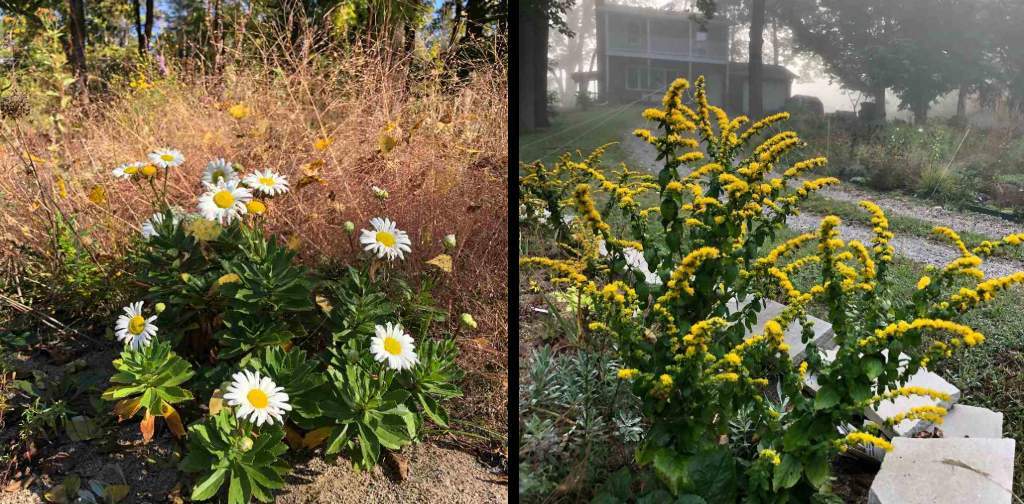 First year - early fall and fall 2022. Left - Nipponanthemum nipponicum (Nipon Daisy) with Eragrostis spectabilis (Purple Love Grass). Right - Solidago sphaecelata 'Golden Fleece' (Autumn Goldenrod 'Golden Flece). All of these plants do well in the sand (in a long term).