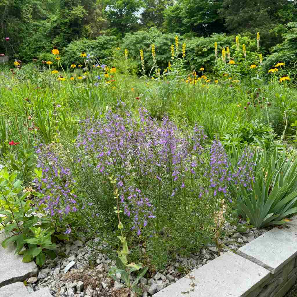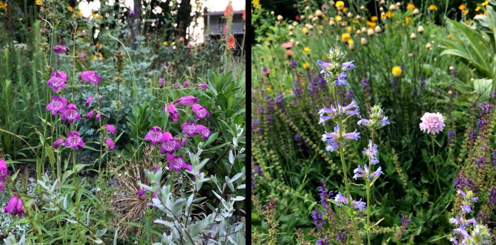 Second year, late spring/early summer 2023. Left - Penstemon x mexicali (Beardtongue hybrid of Californian and Mexican species) with silver-leaved Aster sericeus (Silky Aster). Right - Penstemon ovatus (Eggleaf Beardtongue) from Oregon and Washington. Many species of Penstemon (southwest, west of USA) were planted here and all of those vanished. Those two are exceptions, but still don't do as well as the southeastern natives like P. hirsutus. Abundance of rain in some periods of the year, tropical humidity, or deep frosts are the killers here.