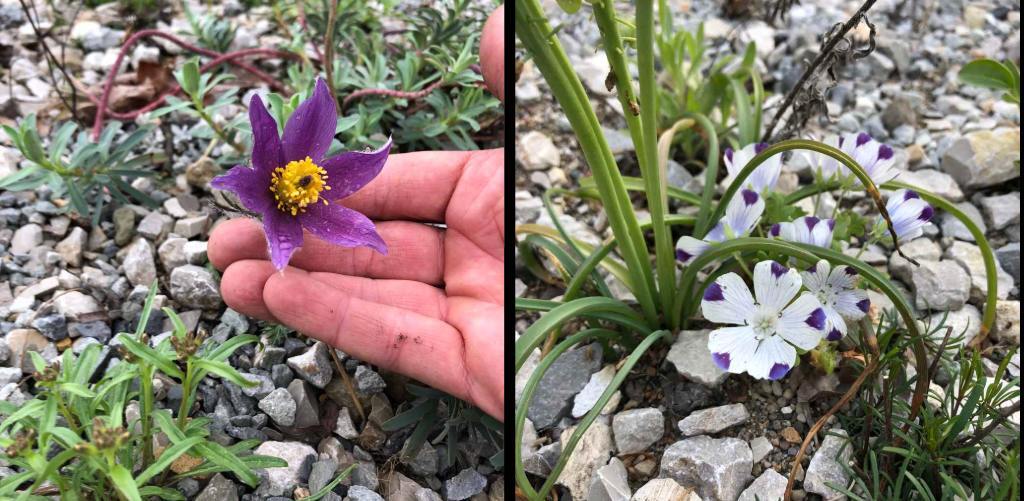 Early spring 2023. Left - Pulsatilla vulgaris (Pasqe Flower) - very easy to grow in Europe (and western USA), but hard for us. Yes, we have a native counterpart - Pulsatilla patens, which seems to be equally hard to cultivate here. Right - Nemophila maculata (Fivespot), annual endemic to California, secondary spread into other parts of USA with wildflower mixes.