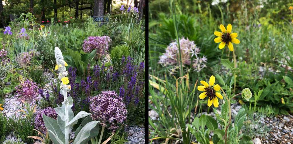 Second year, about late May 2023. Left - Verbascum bombyciferum (Giant Silver Mullein) does struggle in humidity. Here accompanied by Allium christophii (Star of Persia) and Salvia nemorosa 'Maynight Strain' (Meadow Sage). Right - SW USA native Berlandiera lyrata (Chocolate Flower) is ok in the sand.